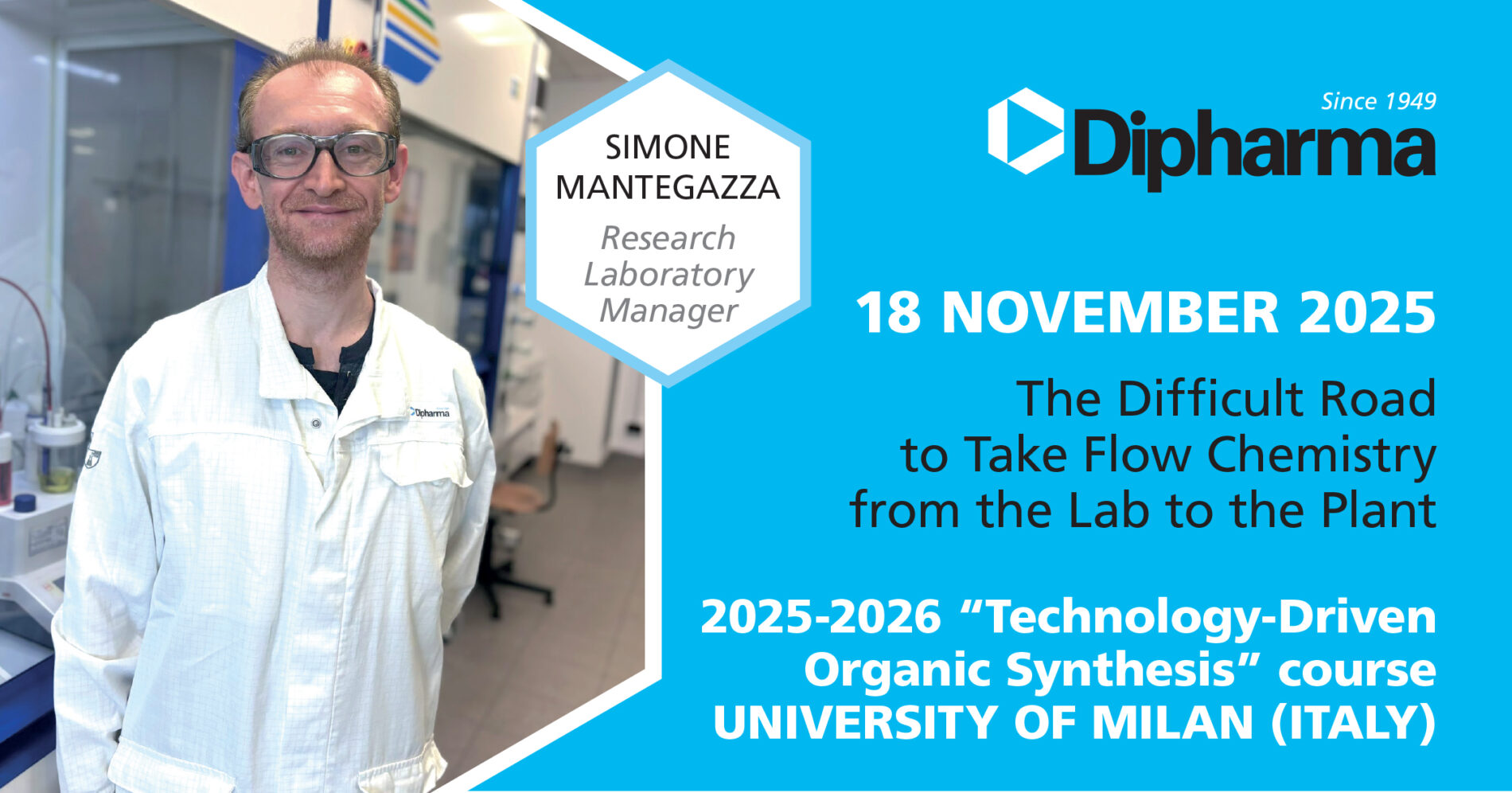 We are pleased to share that our colleague Simone Mantegazza, Research Laboratory Manager, will be delivering a lecture today, 18 November 2025, within the “Technology-Driven Organic Synthesis” course at the University of Milan (Italy).